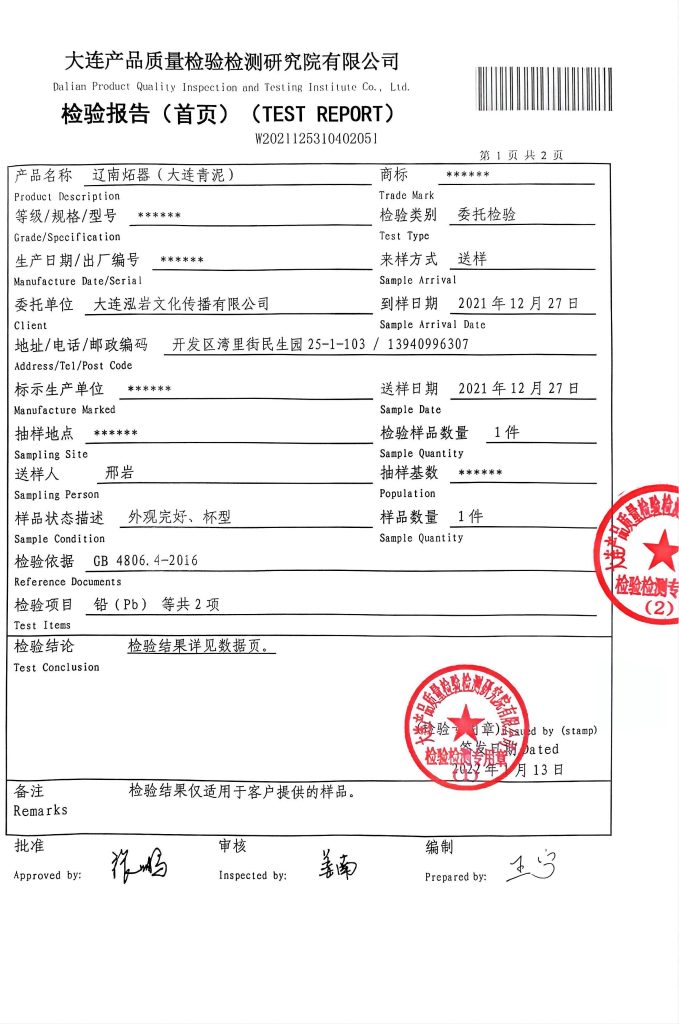 源自金州得胜街道缸窑村刘家窑(始创于清乾隆年间,存续约280年),属钙基黏土矿,生坯呈青灰色特征。烧成特性:氧化焰烧成(780-1000℃)呈红褐色;还原焰烧成(1180-1280℃)显青灰本质。同样由邢岩老师改进了工序,且大连青泥当前属于辽南炻器应用的主要泥料,优秀或获奖作品有:《铁山鬶》、《禾鬲壶》等。